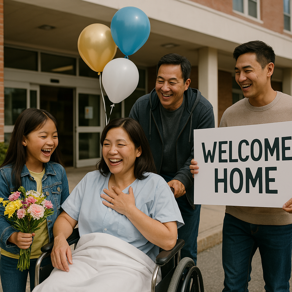 玄関前でご家族がバルーンを手にお出迎え。退院祝いに思わず涙。