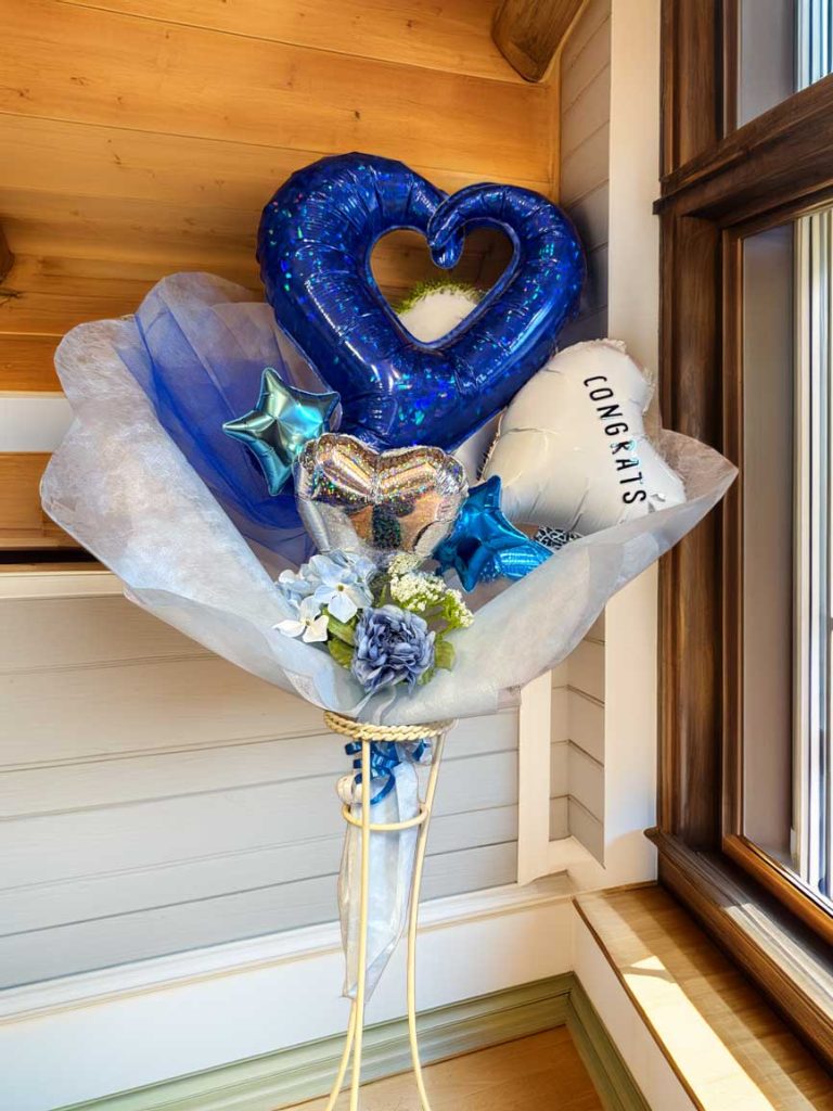 帰宅するとリビングに色とりどりのバルーンとメッセージカード。 心に残るひとときに。